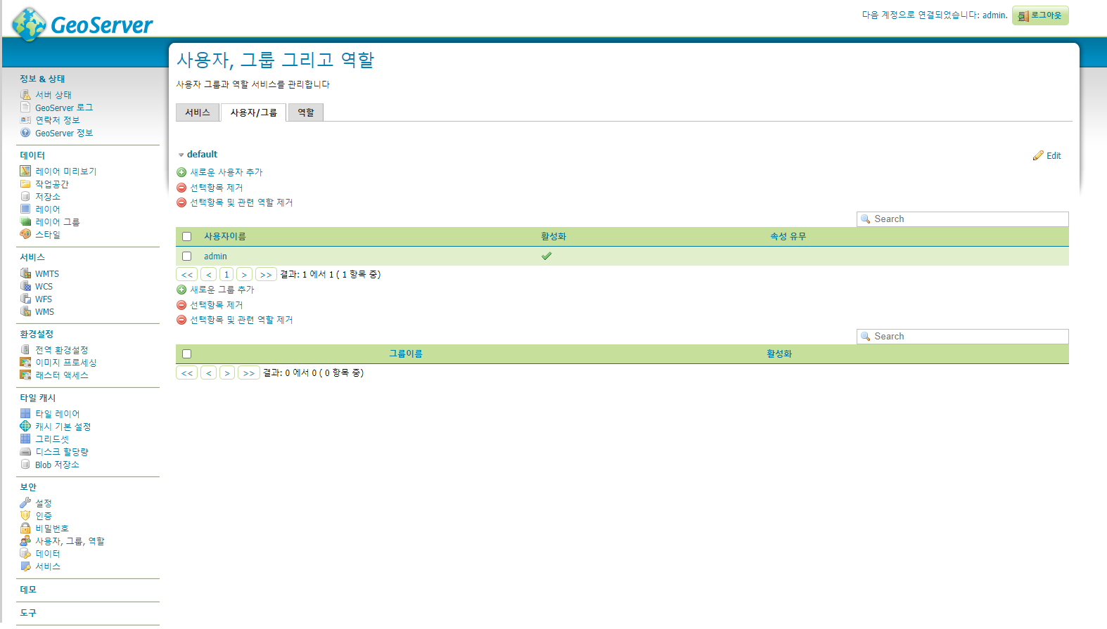 기본 패스워드와 아이디는 admin / geoserver 입니다.
