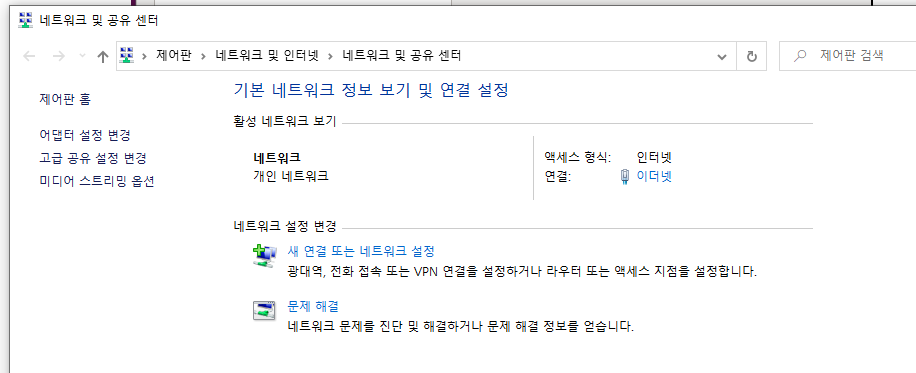 저기서 어댑터 설정을 이더넷 을 클릭 하십시오.