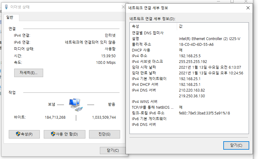 그리고 다시 자세히를 누르시면 오른쪽 그림 같이 아이피가 보일 껍니다.