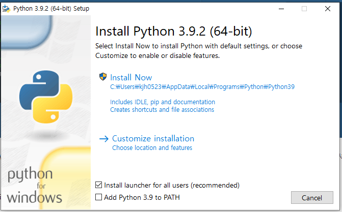요렇게 실행 됩니다. 저기 제일 하단에 Add Python 3.9 to PATH를 체크 하고 Install Now를 클릭 하십시오.