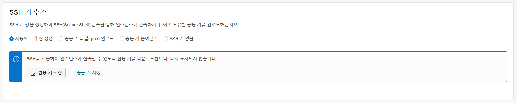 이부분은 중요 합니다. SSH 키 추가에서 전용키 저장, 공용 키 저장을 클릭해서 다운로드 하십시오.