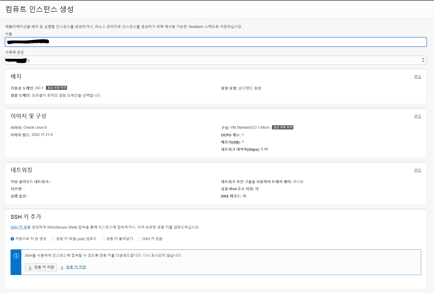이제 VM 인스턴스를 생성해보겠습니다. 오라클 클라우드에서 주의 하실 점은, 돈을 지불하시겠다는 마음을 먹고 계다면 상관 없겠지만, 돈을 안내시려고 제글을 읽고 계실 것이므로 저기 보시면 항상 무료 적격 이라고 붙어 있는 것들만 생성하셔야 합니다. ^^