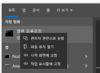 시작줄에서 cmd를 클릭하시면 , 명령프롬프트가 나옵니다. 저기서, 관리자 권한으로 실행을 누르십시오.