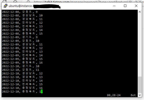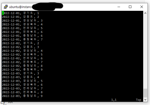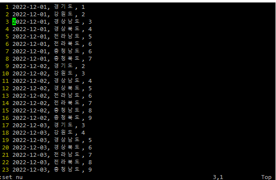 자 이제 다시 vi 도 연습 해볼 겸 해서 실제로 3라인에 경상남도가 있는지 한번 알아보겠습니다.