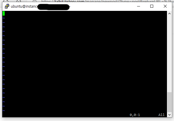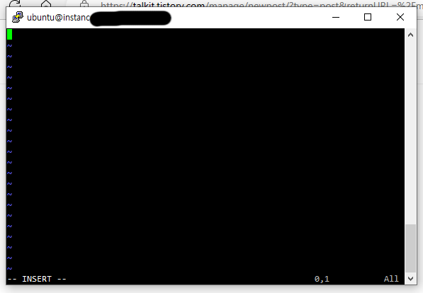 그러면 위에서 보이는 것처럼 vi 가 열립니다. 파일이 동일한 파일명으로 존재하면 파일의 내용이 나오겠지만, 우리는 새로운 파일을 만든다고 가정하므로, 저 그림과 비슷해야 합니다.