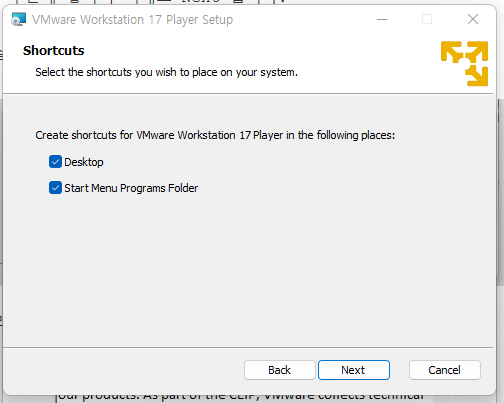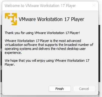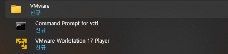 시작 메뉴에서 vmware라고 치시거나, V근처에서 찾으시면 저렇게 VMware 가 있습니다. 거기서 17 Player를 클릭하십시오.
