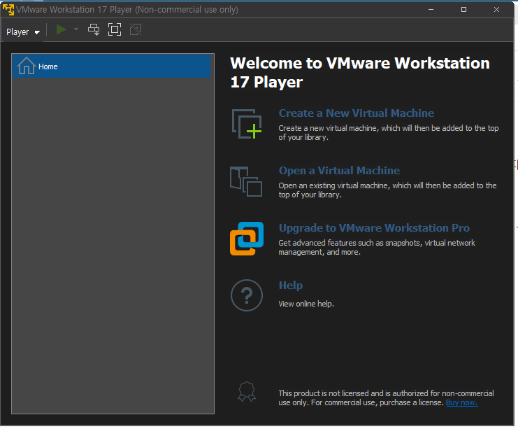 제가 설치해 둔 VMWARE는 16.대 입니다. 하지만, 최신 버전을 설치했구요. 메뉴나 이런 부분은 거의 비슷합니다. 제가 쓸때는 17 버전은 다른 컴에 설치해서 이문서를 적었습니다. ^^