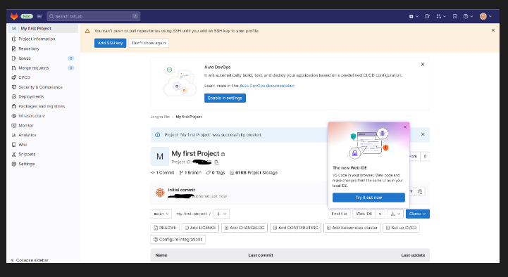오늘은 간단하게 gitlab에서 프로젝트 만드는 방법을 알아 봤습니다.