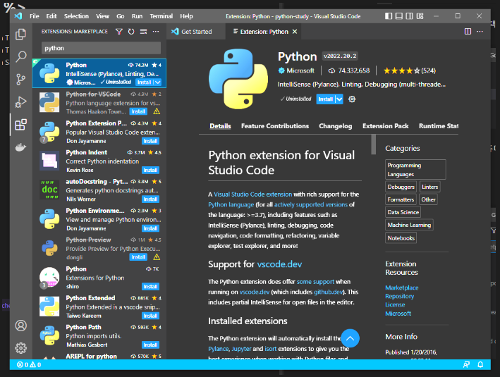 저기서 제일 처음에 Microsoft에서 제공하는 아이를 선택하고 Install 을 클릭 하십시오.