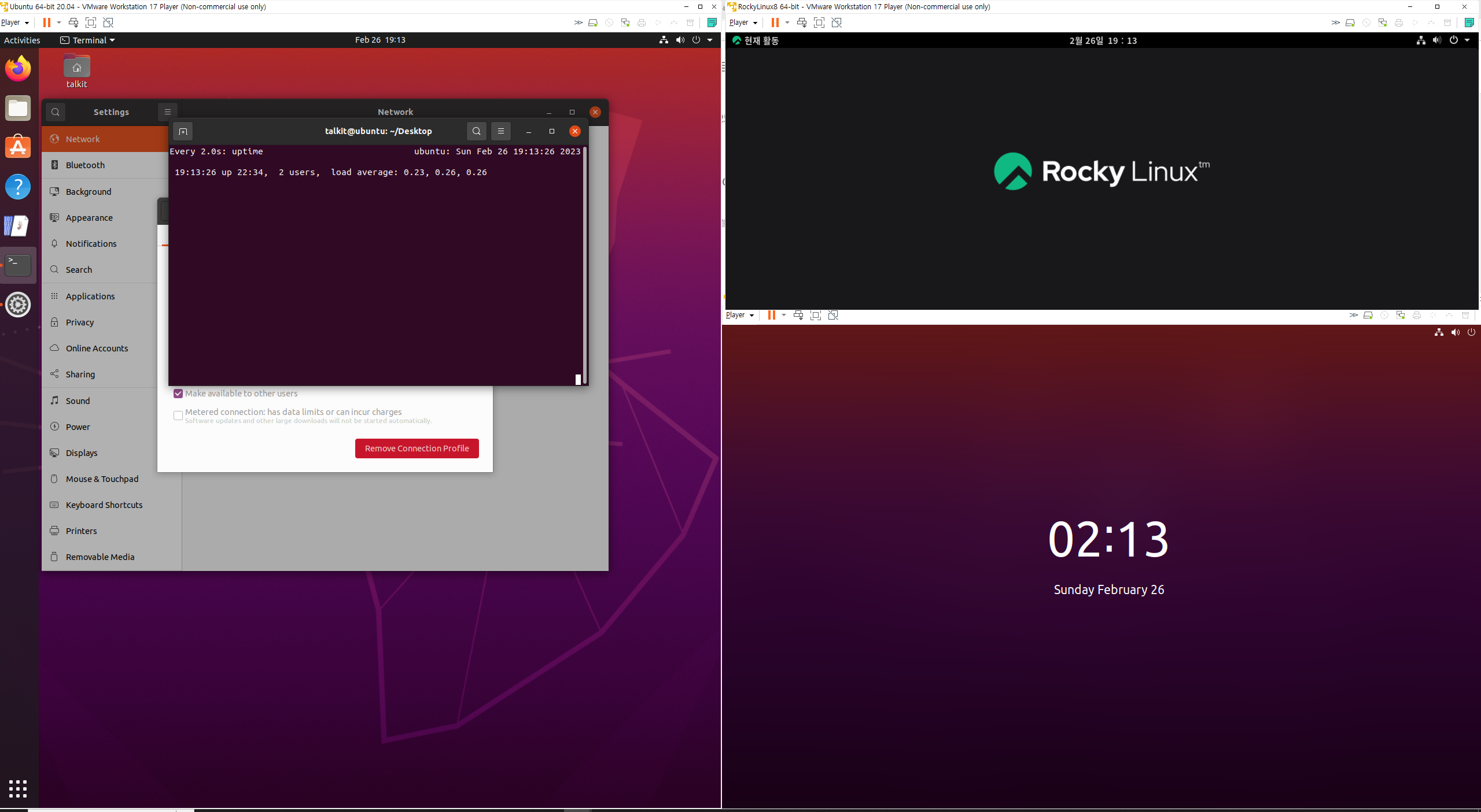 게스트로 우분투 두대와 로키 리눅스 한대가 켜져 있습니다.