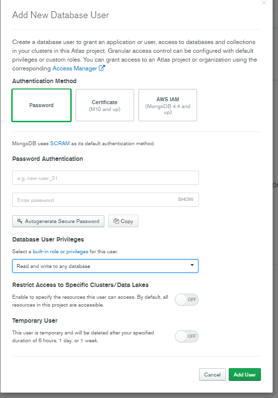 친절하게 왼쪽 메뉴의 Database Access 를 클릭하라고 안내해준다.