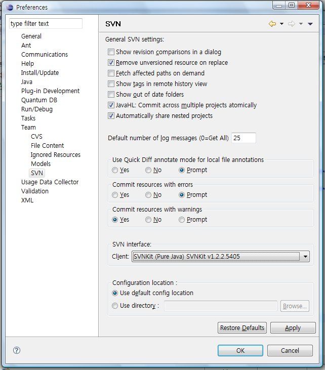 3. Window >> Preferences >> Team >> SVN 항목에 SVN Interface 의 Client를 Pure Java 로 시작하는 놈으로 변경하고 OK 를 누르십시오