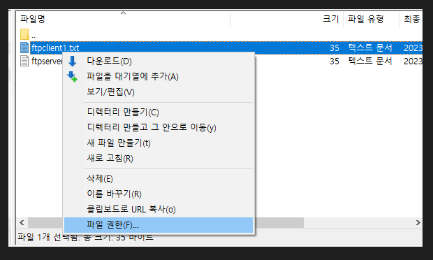 일단 저희는 윈도우즈라서 저기 서버 컴퓨터의 파일에서 오른쪽 마우스 누르시면 파일 권한 팝업이 있습니다.