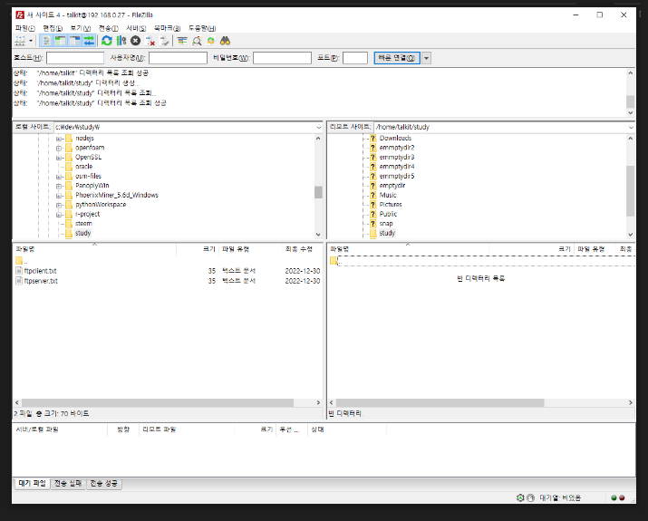 지난 번과 마찬가지로 위창에서 왼쪽은 로컬 컴퓨터의 창이고, 오른쪽은 서버 컴퓨터의 창입니다.