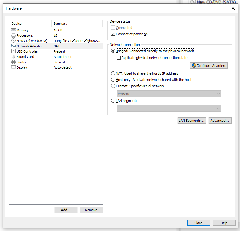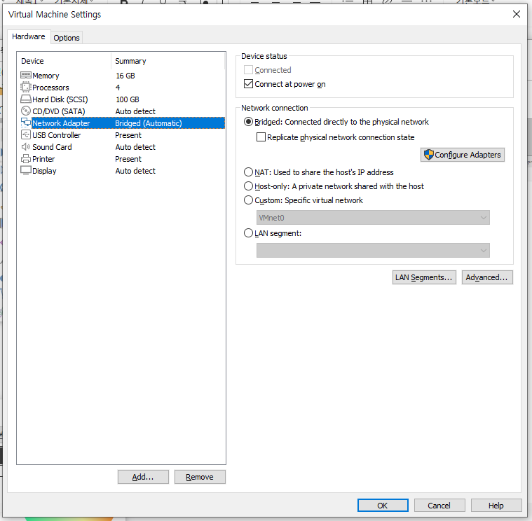 리눅스/Linux VMWARE 네트워크/Network 연결/Connection 방식/Method 변경하기/Change