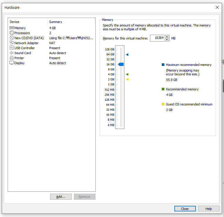제가 설치해 둔 VMWARE는 16.대 입니다. 하지만, 최신 버전을 설치했구요. 메뉴나 이런 부분은 거의 비슷합니다. 제가 쓸때는 17 버전은 다른 컴에 설치해서 이문서를 적었습니다. ^^