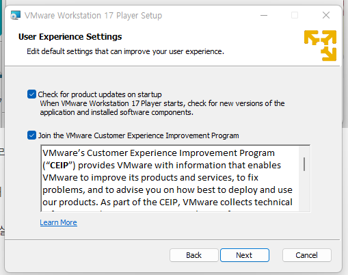 저는 보통 저 두가지를 체크를 해제 합니다. 하나는 VMWARE의 업데이트를 체크할꺼냐? 두번째는 내가 사용한 경험을 VMWARE와 공유할 것인가 입니다. ^^ 저는 체크를 해제 합니다. ^^